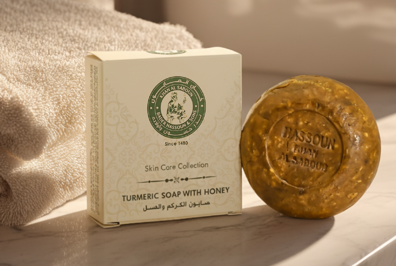 المكونات: الماء العشبي المقطر، مسحوق الكركم، زيت الكركم، زيت الزيتون، زيت اللوز الحلو، الغليسرين النباتي، عسل، ماء الصودا.  طريقة الاستخدام: تغسل البشرة بالماء ثم تستخدم الصابونة وتدلك بلطف على البشرة بحركة دائرية لمدة 30 ثانية ثم تغسل بالماء. تستخدم يومياً وهي مناسبة لجميع أنواع البشرة. اساسيات الجمال في منتج واحد! تحذير: يحفظ بعيدًا عن الحرارة وأشعة الشمس. يحفظ في مكان جاف بعد الاستخدام.